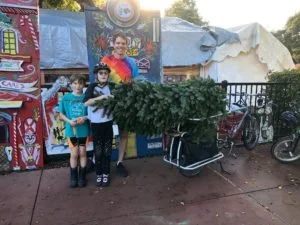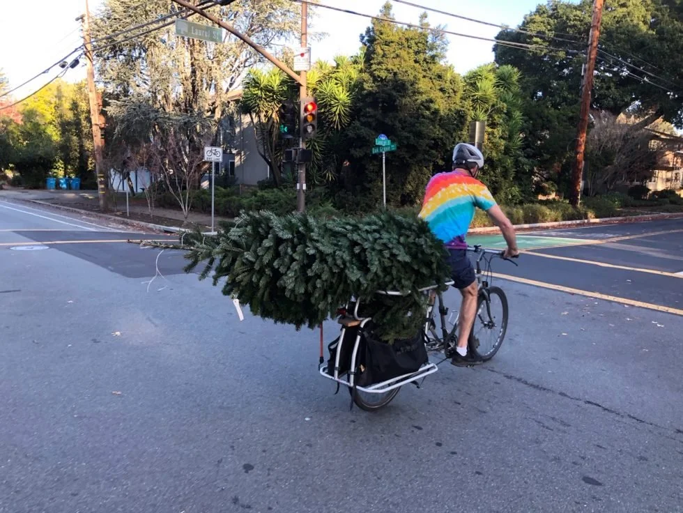 But that accomplishment was recently overshadowed when my friend texted me a picture of her family shopping for aChristmas tree by bike. She told me that they do this each year and have become known by the owner of the tree lot as the family that gets their tree by bike. Impressive! While some of us make excuses for why we can’t ride to the grocery store, or work, or to drop the kids off at school, Chris, Geneva, Bode and Teresa Gadda are showing us all up by carting their tree home on a bike.