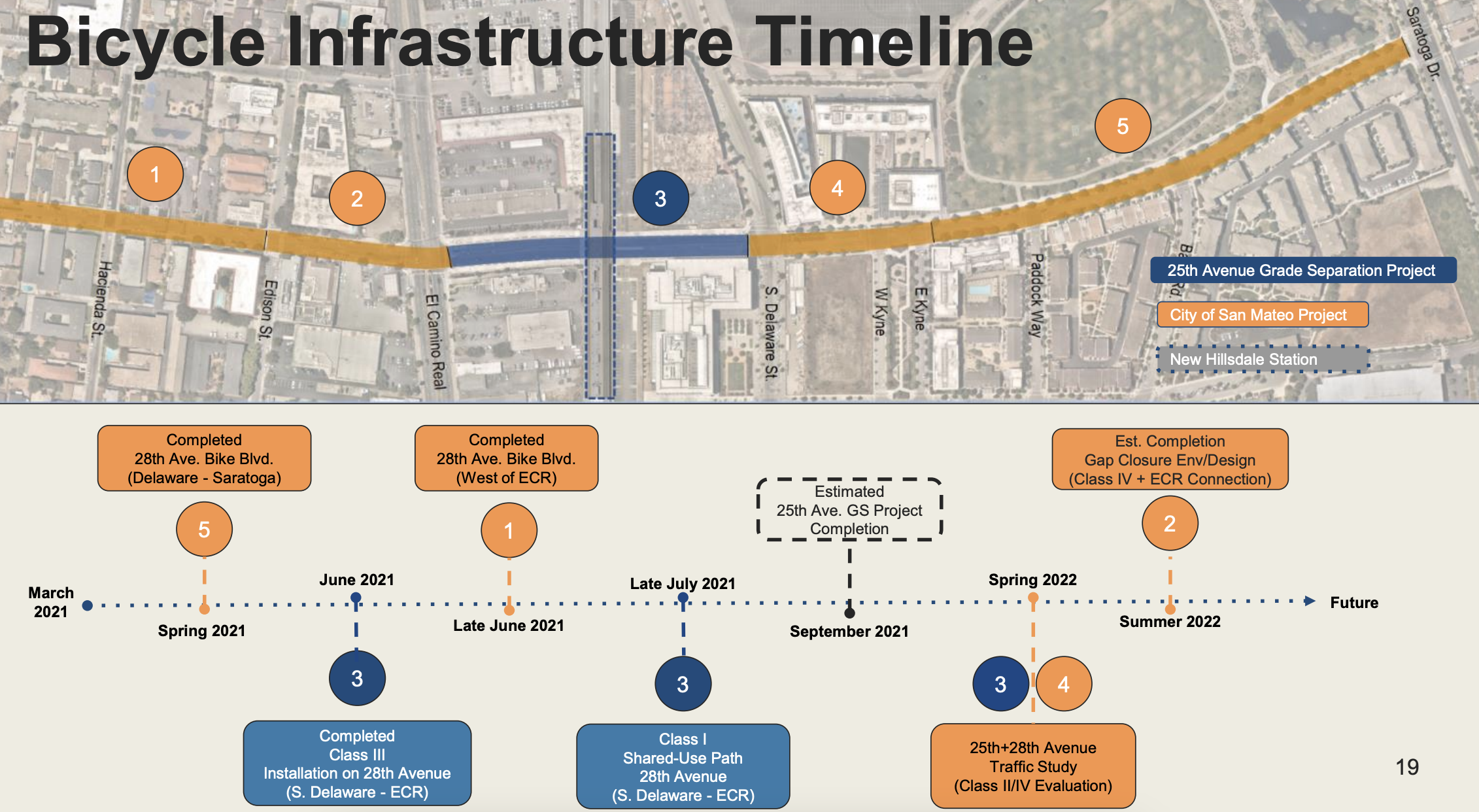Caltrain and the City of San Mateo: Conduct a traffic study in Spring of 2022 for feasibility of Class II or Class IV on 28th Avenue (Delaware -ECR).