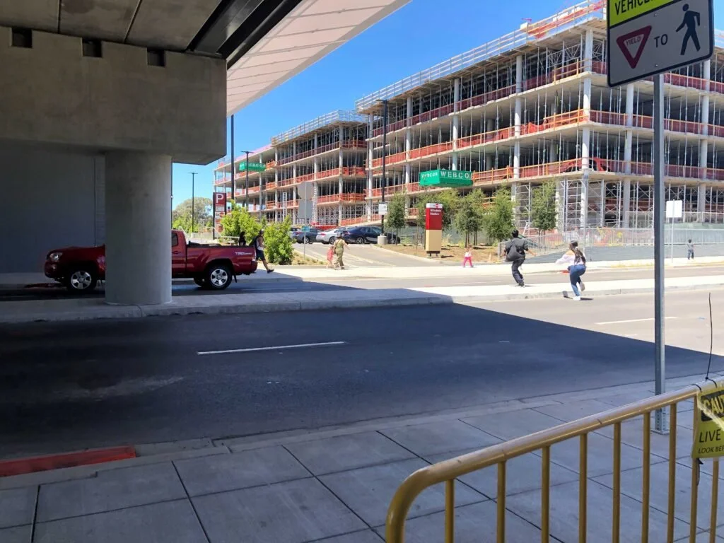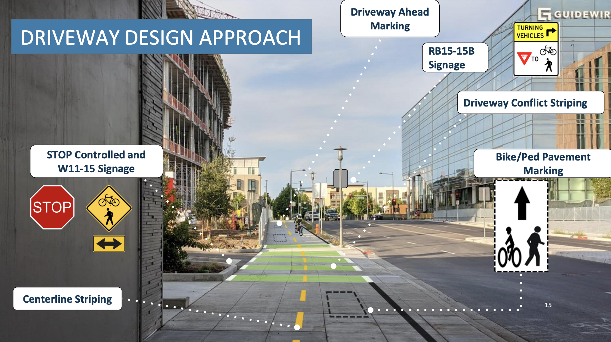 Visibility issues at the North parking lot entrance - The pillars of the elevated Hillsdale station act as visibility barriers for those exiting the parking lot and the sidewalk/Class I facility users. Thanks to community members for pointing this issue out. The agency has now made various driveway improvements to increase bike/ped visibility (see below).