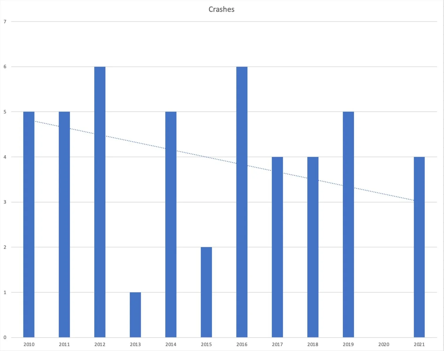 Crash numbers for pedestrians and bicyclists on Ocala. Notice in 2020, the number was zero. This was during the pandemic when driving dramatically decreased and walking and biking increased.