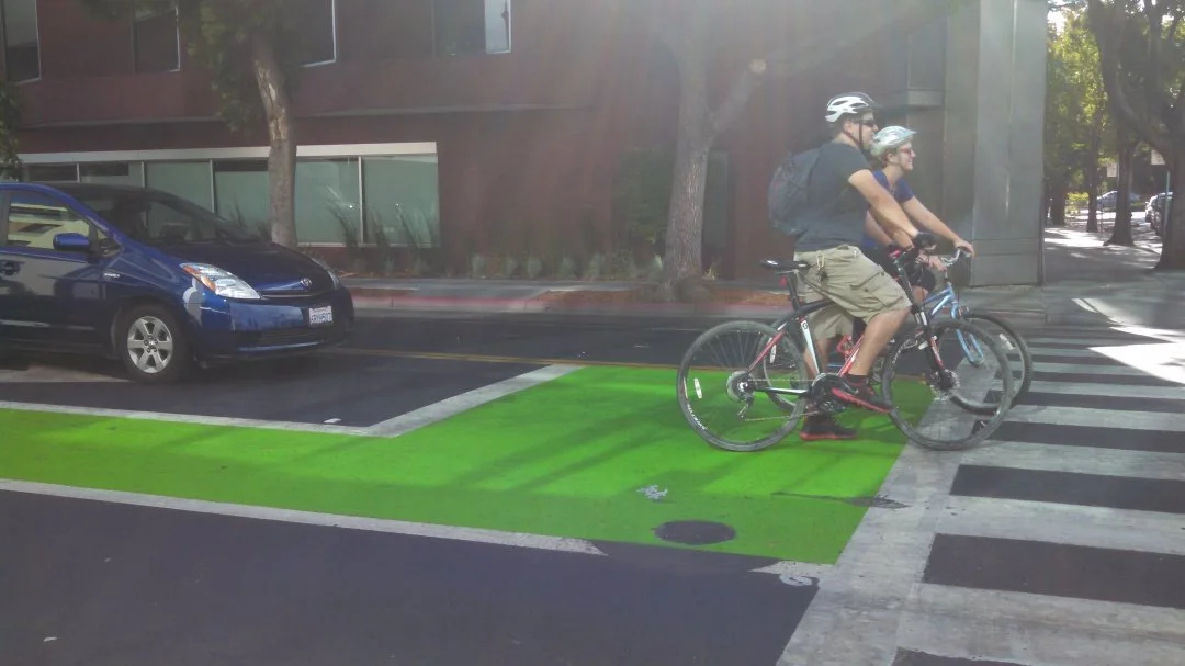 SVBC also promotes the use of green dashed blocks to highlight conflict areas, such as when a car is merging from a through lane to a turn lane or when driveways cross bike lanes.